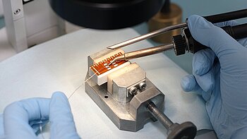 PI Ceramic übernimmt auch die Integration von Piezokomponenten in das Kundenprodukt. Dazu gehören sowohl die elektrische Kontaktierung der Elemente nach Kundenvorgaben als auch die Montage in beigestellte Mechanikteile, das Verkleben oder der Verguss. Für den Kunden beschleunigt das den Herstellungsprozess und verkürzt die Lieferzeiten.
