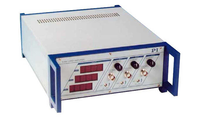 Der Tischverstärker E-663.00 enthält drei rauscharme Verstärkerkanäle für Niedervolt-Piezoaktoren, die Spitzenströme von 140 mA in einem Spannungsbereich von -20 bis +120 V abgeben und aufnehmen können. Zur Anzeige der Ausgangsspannungen stehen drei 3½-stellige LED-Displays zur Verfügung.