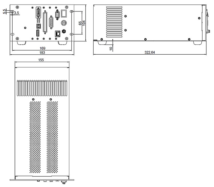 TCP/IP, USB, RS-232, SPI. Je 4 analoge Eingänge und Ausgänge (optional) für externe Sensoren, Sollwertvorgaben oder externe Verstärker. Je 4 digitale Ein- und Ausgänge.