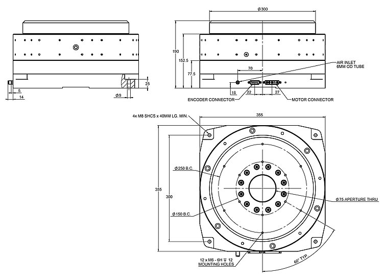 PIglide RM Rotationstisch, Luftlager, 300 mm Durchmesser Bewegungsplattform, 75 mm Länge des Lagersitzes, inkrementelles Winkelmesssystem mit sin/cos-Signalübertragung, 47200 Striche/Umdrehung, nutenloser bürstenloser 3-Phasen-Torquemotor
