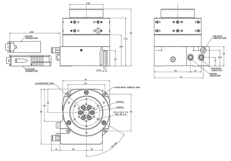 PIglide RM Rotationstisch, Luftlager, 50 mm Durchmesser Bewegungsplattform, 25 mm Länge des Lagersitzes, inkrementelles Winkelmesssystem mit sin/cos-Signalübertragung, 8192 Striche/Umdrehung, nutenloser bürstenloser 3-Phasen-Torquemotor