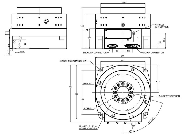 PIglide RM Rotationstisch, Luftlager, 150 mm Durchmesser Bewegungsplattform, 50 mm Länge des Lagersitzes, inkrementelles Winkelmesssystem mit sin/cos-Signalübertragung, 23600 Striche/Umdrehung, nutenloser bürstenloser 3-Phasen-Torquemotor