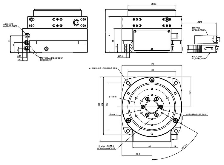 PIglide RM Rotationstisch, Luftlager, 100 mm Durchmesser Bewegungsplattform, 25 mm Länge des Lagersitzes, inkrementelles Winkelmesssystem mit sin/cos-Signalübertragung, 15744 Striche/Umdrehung, nutenloser bürstenloser 3-Phasen-Torquemotor