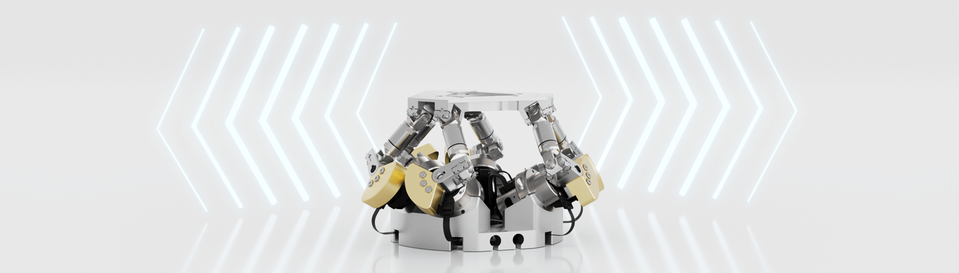 Das Hebelprinzip mit tief montierten Antrieben in einer Hexapod-Kinematik ermöglicht eine dynamische und präzise 6-Achs-Positionierung in einem kompakten, flachen Bauraum. Dabei werden eine hohe thermische Stabilität und eine hohe Lebensdauer erreicht.