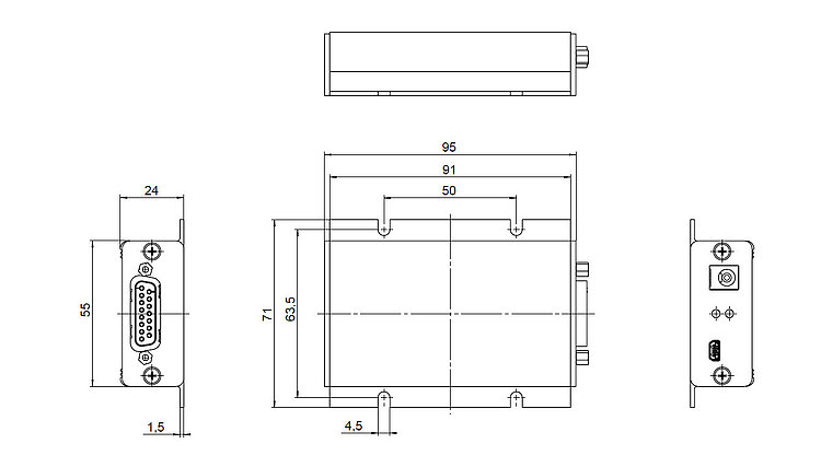 USB-Schnittstelle zur Kommandierung. Differenzielle Signalübertragung (A/B). Eingänge für TTL-Signale für End- und Referenzschalter.