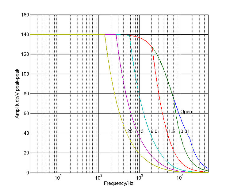 Spitzenleistung bis 280 W, Dauerausgangsleistung bis zu 100 W. Abgabe und Aufnahme eines Spitzenstroms bis 2000 mA. Dynamischer Betrieb von Piezoaktoren mit hoher Kapazität bei einer Bandbreite bis in den Kilohertzbereich.