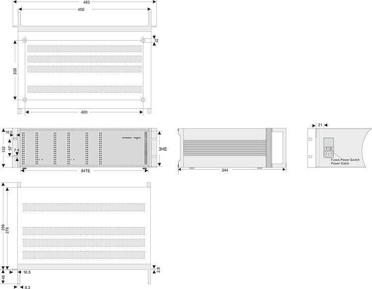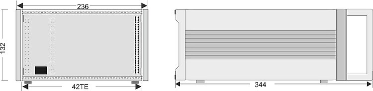 Abmessungen | 21 HP/3 U | 236 × 132 × 296 mm (ohne Griffe) / |
