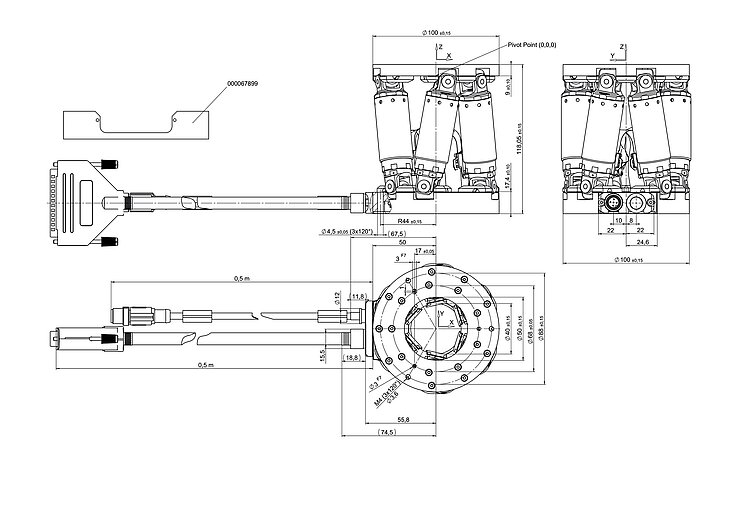 Miniatur-Hexapod für 6 Freiheitsgrade der Bewegung; BLDC-Motoren; 3 kg Nutzlast; 6 mm/s Geschwindigkeit; 0,5 m Kabellänge. Anschlusskabel sind nicht im Lieferumfang enthalten und müssen separat bestellt werden.