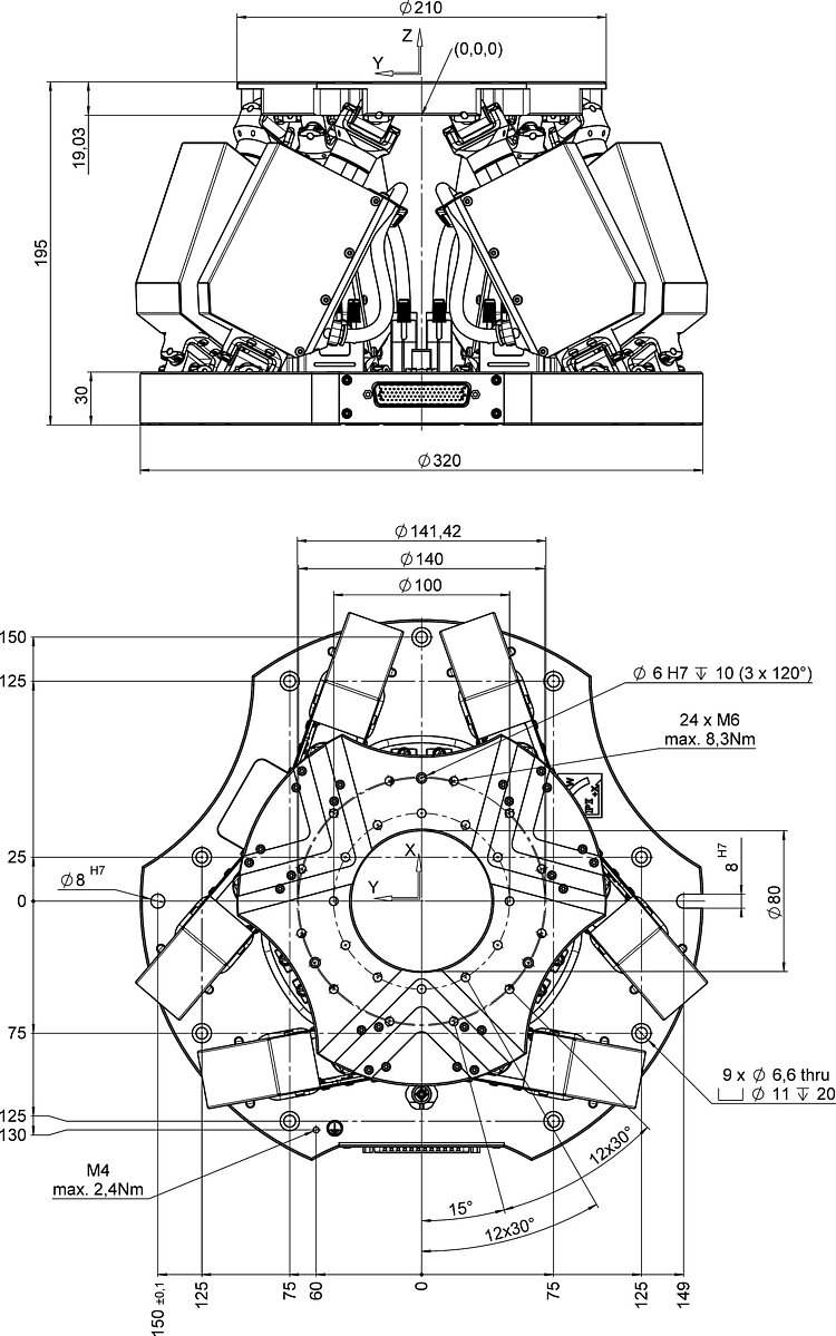 Kompakter Hexapod; bürstenloser DC-Getriebemotor; Absolutencoder; 30 kg Nutzlast; 2,5 mm/s maximale Geschwindigkeit. Anschlusskabel sind nicht im Lieferumfang enthalten und müssen separat bestellt werden.