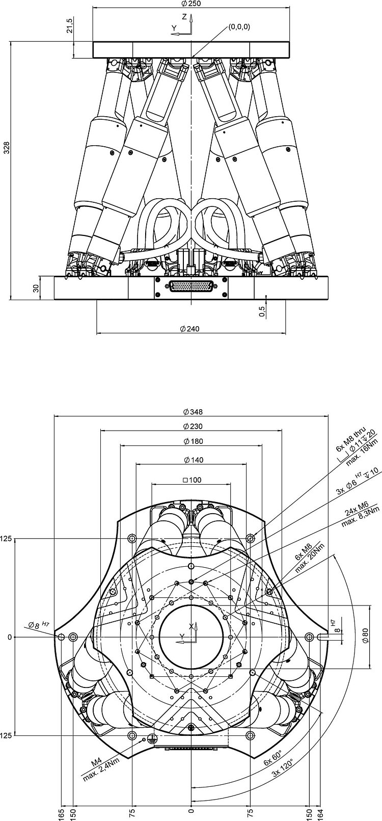 Präziser Hexapod-Mikroroboter, bürstenloser DC-Getriebemotor, Absolutencoder, 250 kg Belastbarkeit, 0,5 mm/s Geschwindigkeit. Anschlusskabel sind nicht im Lieferumfang enthalten und müssen separat bestellt werden.