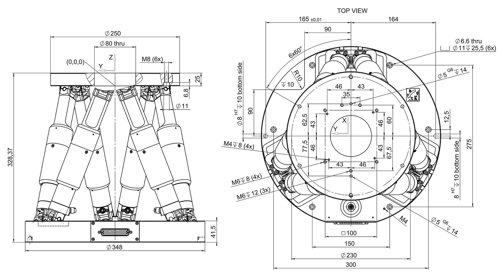 Präziser Hexapod; DC-Getriebemotor; Rotationsencoder; 80 kg Nutzlast; 0,15 mm/s maximale Geschwindigkeit; vakuumkompatibel bis 10-6 hPa; Kabelsatz 2 m vakuumseitig; Durchführung. Luftseitige Anschlusskabel sind nicht im Lieferumfang enthalten und müssen separat bestellt werden.