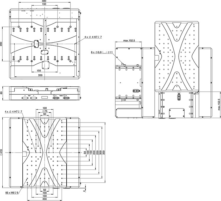 Präzisions-Kreuztisch; DC-Motor; 305 mm × 305 mm Stellweg (X × Y); 200 N Belastbarkeit; 50 mm/s × 50 mm/s maximale Geschwindigkeit; Kugelumlaufspindel; Inkrementeller Linearencoder, 20 µm Sensorsignalperiode, Sin/Cos, 1 V Spitze-Spitze