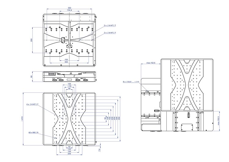 Hochpräzisions-Kreuztisch; Eisenloser 3-Phasen-Linearmotor; 305 mm × 305 mm Stellweg (X × Y); 50 N Belastbarkeit; 200 mm/s × 200 mm/s maximale Geschwindigkeit; Inkrementeller Linearencoder, 20 µm Sensorsignalperiode, Sin/Cos, 1 V Spitze-Spitze