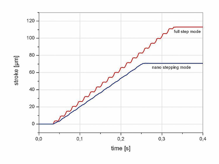 Geschwindigkeit im Nanoschritt-Betrieb: Abhängig von der Steuerelektronik. Die Maximalgeschwindigkeit im Nanoschritt-Betrieb ist auf größtmögliche Konstanz ausgelegt, so dass keine Geschwindigkeitsschwankungen beim Ausführen der Schritte auftreten.