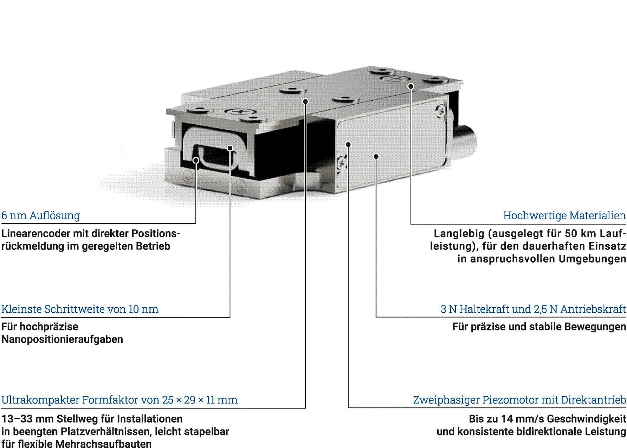 Mit einer Betriebsfrequenz von bis zu 20 kHz erreichen direkt auf den Läufer wirkende Antriebe Geschwindigkeiten von bis max. 14 mm/s.