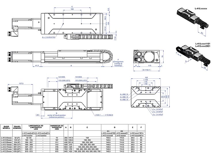 - Versionen mit Linearencoder mit Schleppkette und Anschlussbox (L-412.xxxxxxE1).