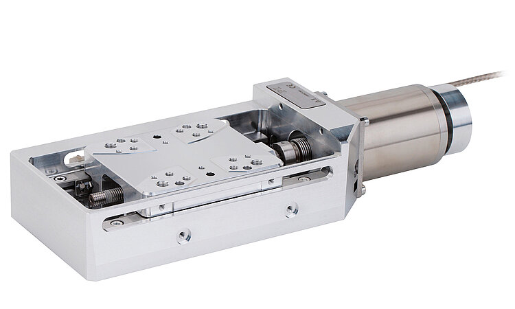 Vakuumgeeigneter Präzisions-Lineartisch; DC-Getriebemotor; 26 mm Stellweg; 100 N Belastbarkeit; 1,5 mm/s maximale Geschwindigkeit; Kugelumlaufspindel; Inkrementeller Rotationsencoder, A/B-Quadratur, RS-422; vakuumkompatibel bis 10⁻⁶ hPa