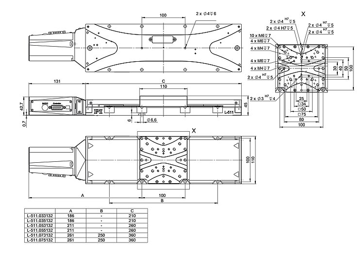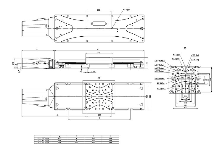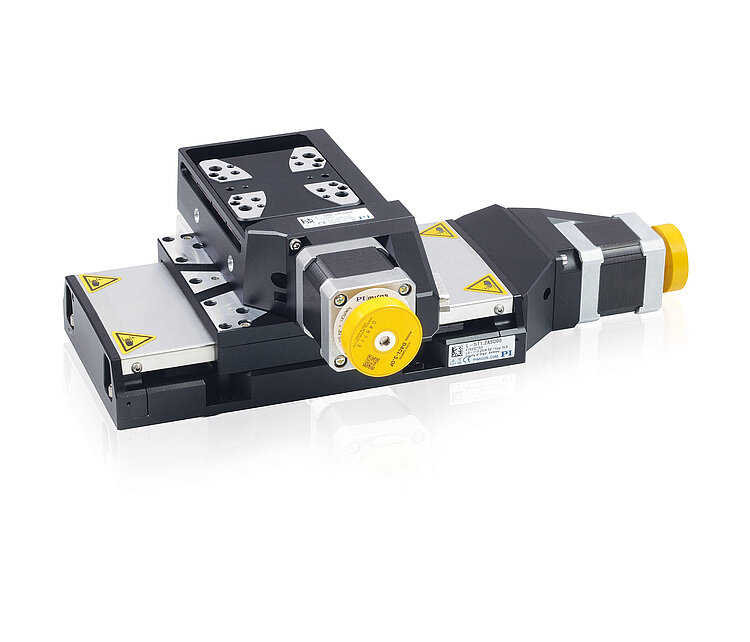 Hochpräziser Lineartisch; Bürstenloser DC-Motor; 102 mm Stellweg; 500 N Belastbarkeit; 90 mm/s maximale Geschwindigkeit; Kugelumlaufspindel; Inkrementeller Rotationsencoder, 20000 Impulse/U Auflösung, A/B-Quadratur, RS-422; Inkrementeller Linearencoder, 20 µm Sensorsignalperiode, Sin/Cos, 1 V Spitze-Spitze