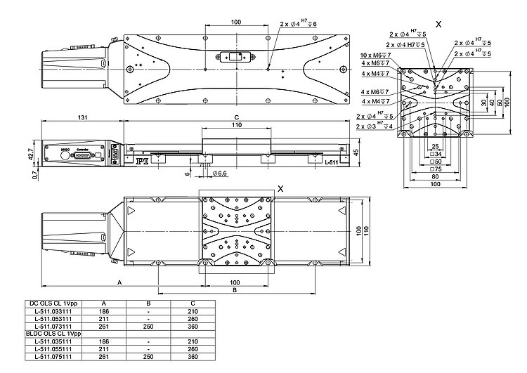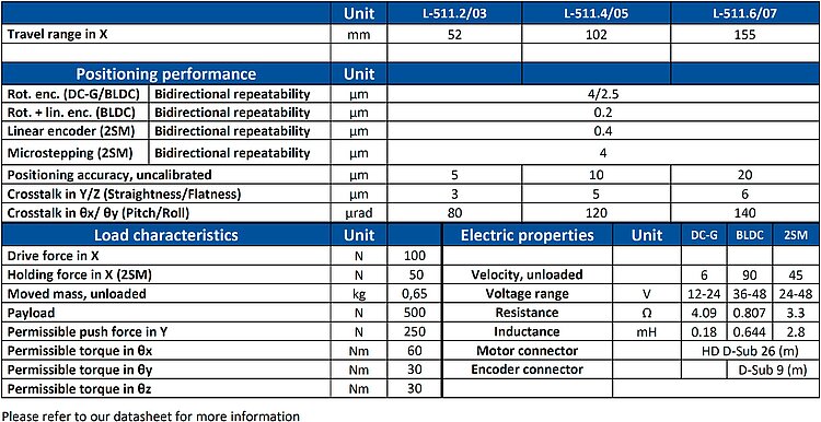 Hochpräziser Lineartisch; Bürstenloser DC-Motor; 52 mm Stellweg; 500 N Belastbarkeit; 90 mm/s maximale Geschwindigkeit; Kugelumlaufspindel; Inkrementeller Rotationsencoder, 20000 Impulse/U Auflösung, A/B-Quadratur, RS-422; Inkrementeller Linearencoder, 20 µm Sensorsignalperiode, Sin/Cos, 1 V Spitze-Spitze