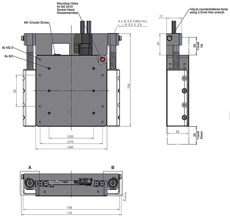 Kompakter Hochpräzisions-Lineartisch mit Direktantrieb zur vertikalen Montage; Eisenloser 3-Phasen-Linearmotor; 40 mm Stellweg; 1,2 kg Nutzlast; 500 mm/s maximale Geschwindigkeit; Inkrementeller Linearencoder, 20 µm Sensorsignalperiode, Sin/Cos, 1 V Spitze-Spitze; Magnetisches Gegengewicht