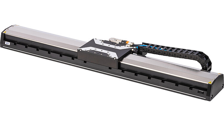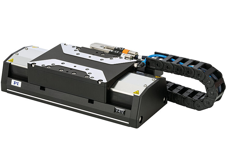 Hochlast-Lineartisch; Eisenloser 3-Phasen-Linearmotor; 407 mm Stellweg; 400 N Belastbarkeit; 2000 mm/s maximale Geschwindigkeit; Absoluter Linearencoder, 1 nm Sensorauflösung, EnDat 2.2; Schleppkette