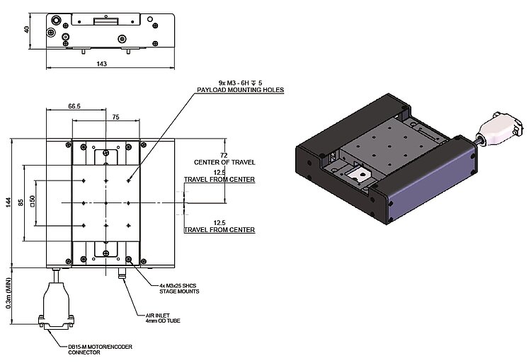 PIglide Miniatur-Lineartisch mit Luftlager; Eisenloser 3-Phasen-Linearmotor; 25 mm Stellweg; 40 N Belastbarkeit; 390 mm/s maximale Geschwindigkeit; Absoluter Linearencoder, 1 nm Sensorauflösung, BiSS-C; Elektromagnetische Haltebremse; 0,5 m Kabellänge
