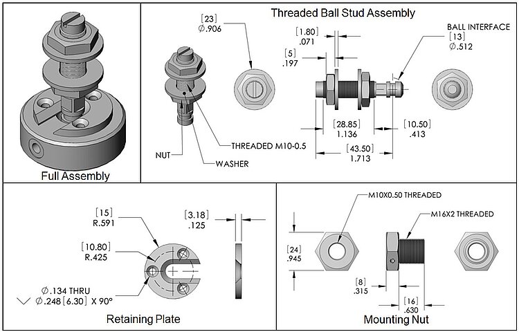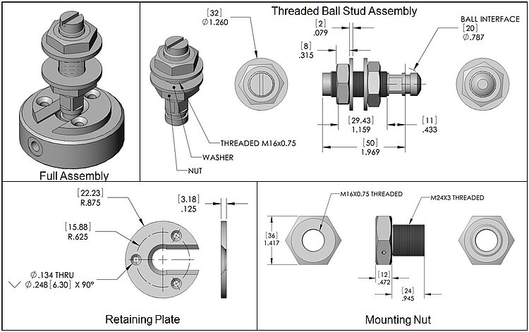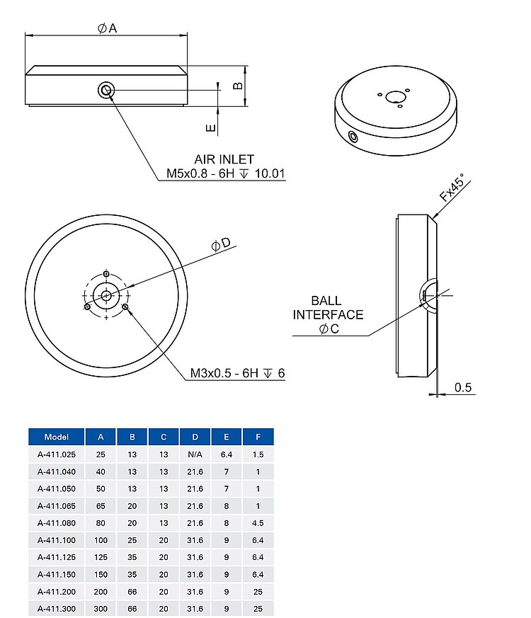 Teil # | Durchmesser / mm | Durchmesser Kugelschnitt- | Belastbarkeit / N | Steifigkeit / N/µm | Luftdurchsatz / l/h (SCFH) | Masse / g |