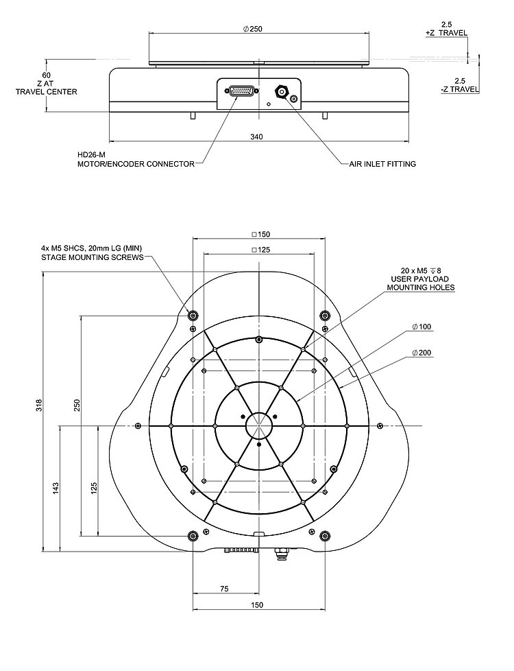 Hinweis zur zulässigen Druckkraft: Geht von einem Betriebsdruck der Luftlager von 480 kPa aus. Der Tisch ist nur für den horizontalen Betrieb ausgelegt.