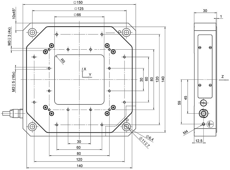 PIMars Nanopositioniertisch; 45 µm × 45 µm × 15 µm Stellweg (X × Y × Z); kapazitiv, indirekte Positionsmessung; D-Sub 25W3 (m); Direktantrieb