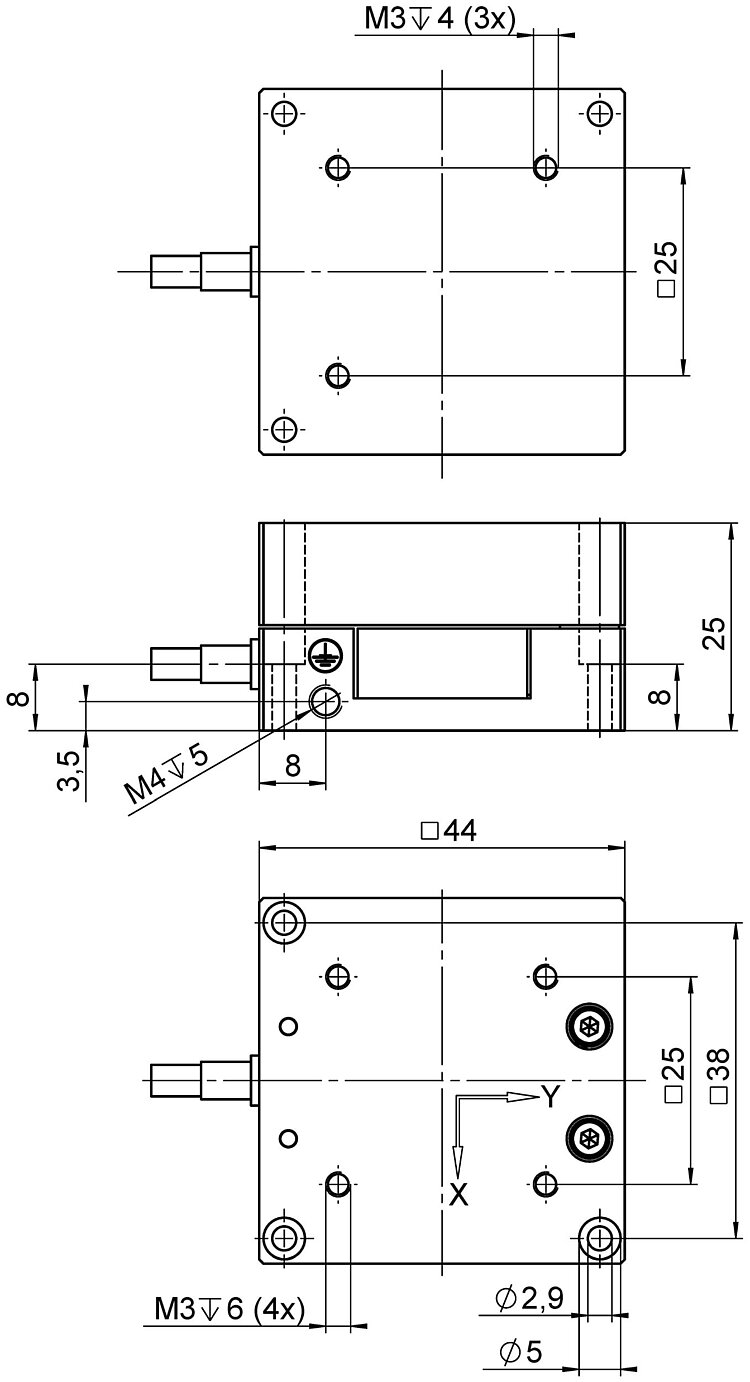 XY-Nanopositionierer; 100 µm × 100 µm Stellweg (X × Y); DMS, indirekte Positionsmessung; LEMO-Stecker; 1,5 m Kabellänge