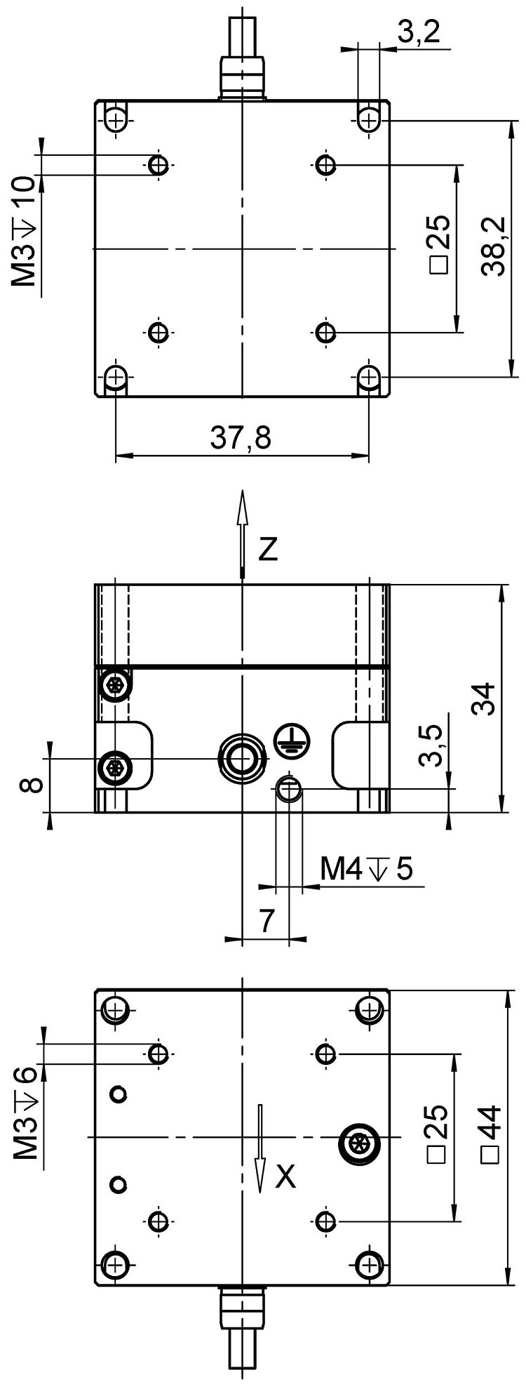 XZ-Nanopositionierer; 100 µm × 100 µm Stellweg (X × Z); DMS, indirekte Positionsmessung; LEMO-Stecker; 1,5 m Kabellänge