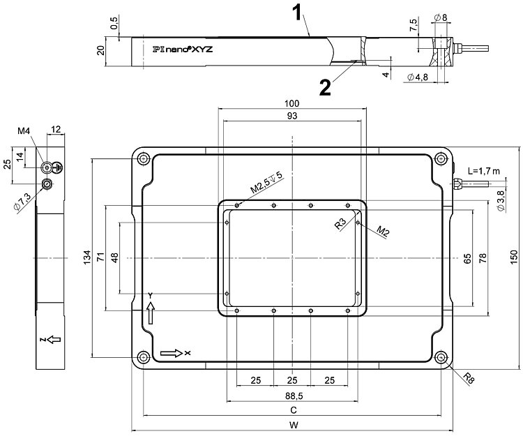 PInano® XY-Piezosystem; freie Apertur für Objektträger; 200 µm × 200 µm Stellweg (X × Y); piezoresistiv, direkte Positionsmessung; D-Sub 37 (m)-Stecker; 1,7 m Kabellänge; mit USB-Digitalcontroller