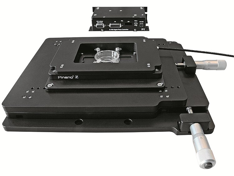 PInano® Z-Piezoscannersystem; 100 µm Stellweg; freie Apertur für Objektträger; piezoresistive Sensoren; mit USB-Digitalcontroller