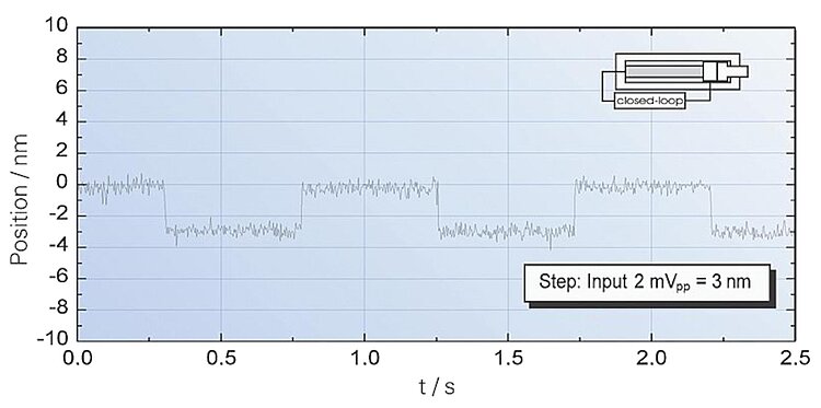 Die Auflösung des Systems wird nur vom Rauschen des Verstärkers und der Messtechnik begrenzt, da PI-Piezoaktoren reibungsfrei arbeiten.