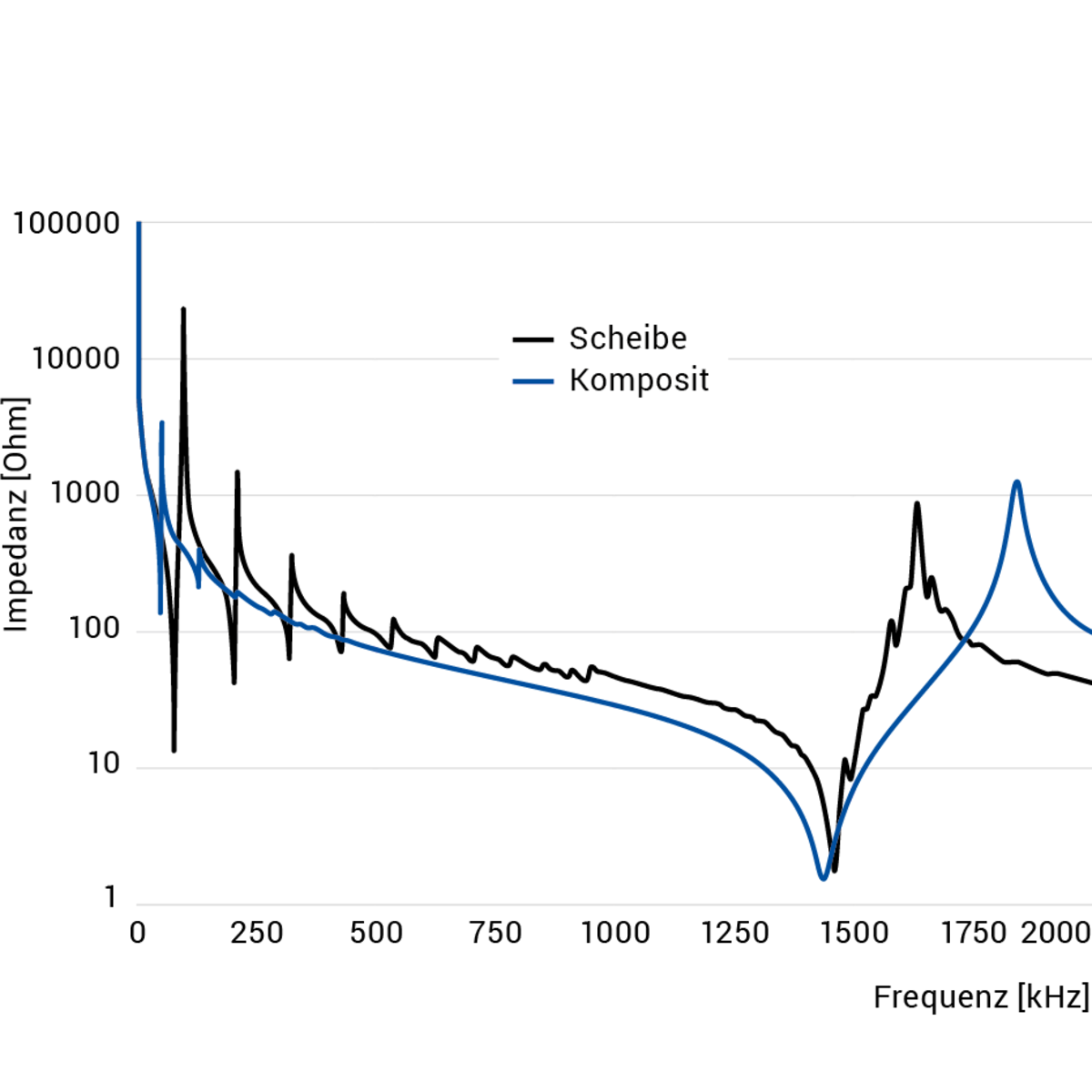 Im Vergleich piezoelektrische Vollkeramik-Scheibe zu Komposit zeigt sich eine Verringerung der akustischem Impedanz, was zu einer Verbesserten Kopplung zu Wasser oder Organgewebe führt.