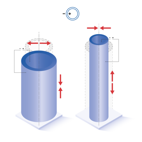 Polarisierungsrichtung | Je nach Kontaktierung und Anbringung der Elektroden entstehen unterschiedliche Auslenkungen in axialer, radialer sowie lateraler Richtung. Weitere Informationen finden Sie unter >> Funktionsweisen. |