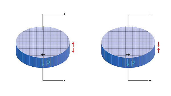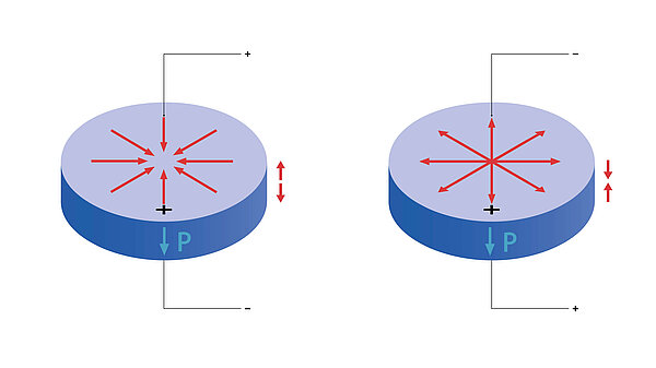 Wird die Piezoscheibe hingegen als Aktor verwendet, erfolgt bei Anlegen einer elektrischen Spannung eine mechanische Auslenkung. Diese kann entweder als statische Verformung durch Gleichspannung oder als Schwingung, beispielsweise im Ultraschallbereich, durch Wechselspannung auftreten. Abhängig vom Aufbau der Piezokomponente kann die Bewegung in longitudinaler oder radialer Richtung erfolgen. Die Amplitude der Auslenkung hängt sowohl von der Größe der Piezoscheibe als auch von der angelegten Spannung ab.