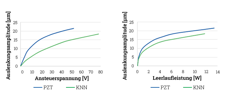 Die Parameter des >> Werkstoffs sind entscheidend für das Erreichen der gewünschten Spezifikationen eines Leistungsultraschall-Transducers. Durch die Verwendung von bleifreien Ringen (KNN) wird die Auslenkung bei gleicher Leistung sowie gleicher Spannung reduziert. Dies kann durch eine höhere Ansteuerspannung kompensiert werden.