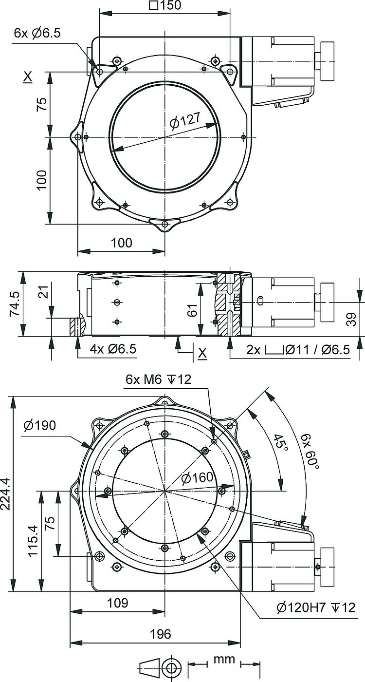 Schneckenantrieb mit hoher Untersetzung für präzise Positionierung. Hervorragende Ablaufebenheit und Rundlauf durch vorgespannte Kreuzrollenlager. Große Apertur mit 120 mm Ø. Zwei einstellbare Endschalter.