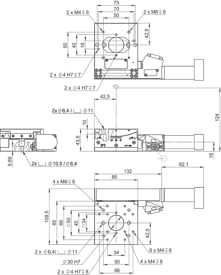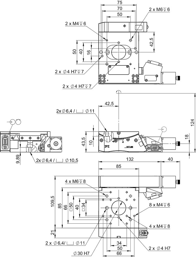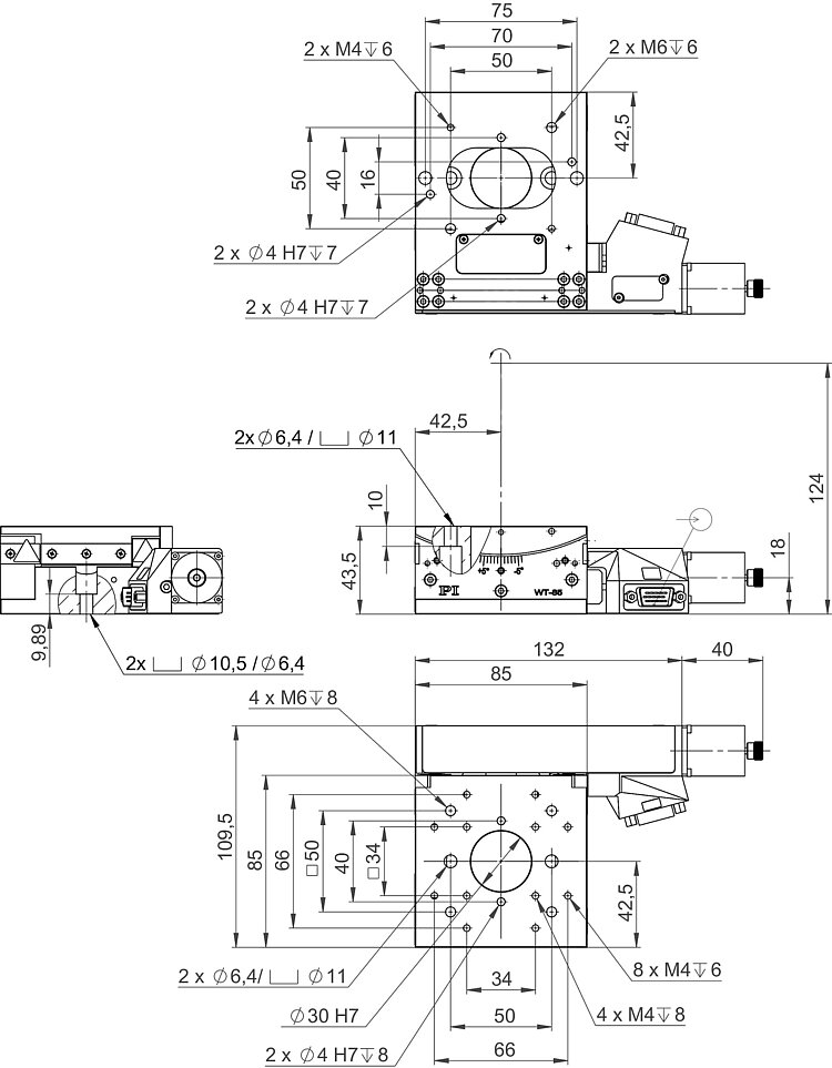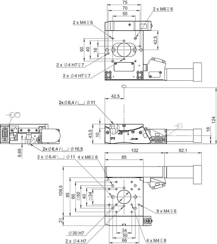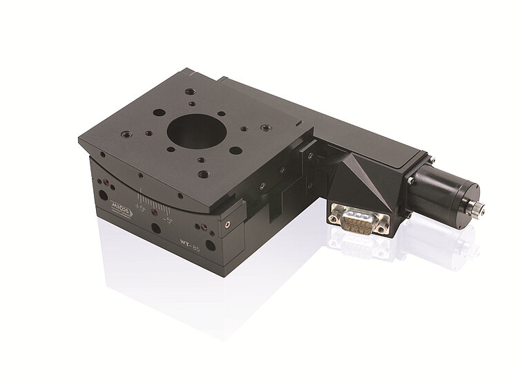 WT-85 Goniometertisch, 85 mm Breite, DC-Motor, ±5° Drehbereich, Winkelmesssystem mit A/B-Quadratur-Signalübertragung, freie Apertur 30 mm Durchmesser, mechanische Endschalter