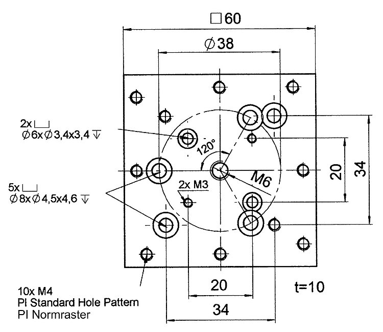 Adapterplatte zur Montage von Tischen ohne PI-Gewindenormraster auf Tischen mit PI-Gewindenormraster