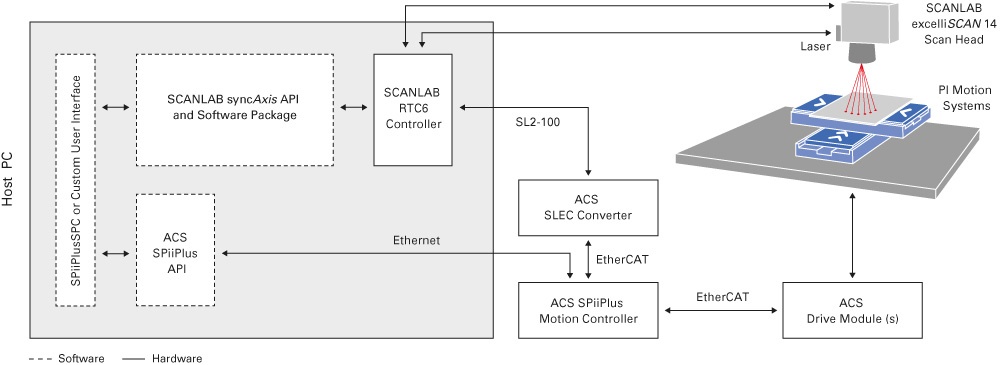 Die SCANLAB GmbH produziert Galvanometerscanner, von denen bestimmte Modelle in der Lage sind, einen 2D-Scankopf und zwei mechanische Achsen (z. B. einen XY-Positioniertisch mit zwei Servoachsen) synchron anzusteuern. Die ACS Motion-Controller-Plattform von PI ermöglicht diese Funktionalität mit dem sogenannten XL SCAN-Verfahren. Bei Einsatz mit einem motorisierten Positionierer von PI bietet die Lösung einen nahezu unbegrenzten Arbeitsbereich.